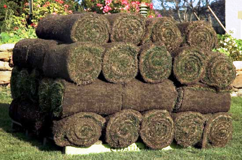 Two blondes were sipping their Starbucks when a truck went past loaded up with rolls of sod.