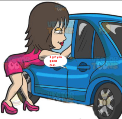 A guy pulls his car up to an obvious street hooker and in broken English, “Hey, lady I gif you $100 make boom boom immigrant style wit me. “Get lost,” she tells him.